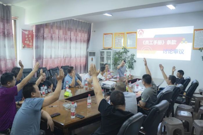 會(huì)議環(huán)節(jié),安環(huán)委主任通篇朗讀新版《員工手冊(cè)》安全管理?xiàng)l款,公司各部門中層及以上管理人員共同討論審議,舉手表決,全票通過。新版《員工手冊(cè)》將于2023年7月在朝陽集團(tuán)正式啟用執(zhí)行。